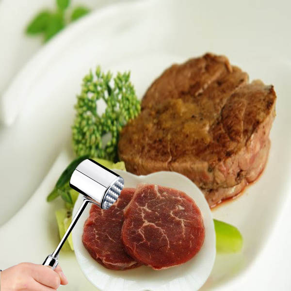 3、肉锤是做牛排的好帮手啊,钝的面可以切断肉质纤维,用平滑的一面扩展肉块,可把牛